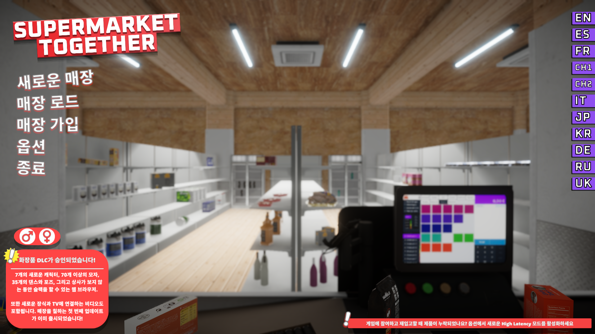 처음 게임을 시작하면 이러한 화면이 보이는데, '매장 로드' 탭은 자신이 가지고 있는 서버 세이브 파일을 확인할 수 있고 '매장 가입' 탭으로 타인의 서버에 참여할 수 있다. 덕분에 싱글 플레이와 멀티 플레이를 자신의 입맛대로 골라 즐길 수 있다. 좌측 아래 표시되는 DLC는 아직 구입하지 않아 자세하게 다루기 어려우니 관심이 있다면 스팀 리뷰를 잘 살펴보길 바란다.